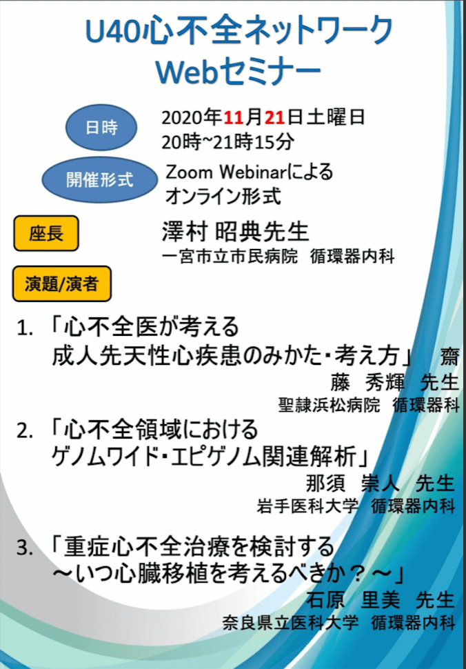 新生2020-2021 U40心不全ネットワークの企画第1弾として、ZoomでのWebセミナーを企画しております。ぜひ皆様奮ってご参加ください。